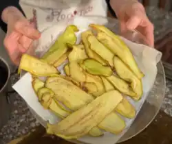 The town of Minori, located near Maiori, is closely associated with the dessert. Townspeople eat it yearly on 13 July during the feast of the town's patron saint, Trofimena. Baby eggplants are stuffed with ricotta and candied fruit, fried, dipped in melted chocolate, and left to set. It is served with the Italian liqueur limoncello.[6]