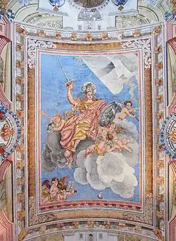 This depiction is said to have originally represented the Order of St John, which ruled Malta between the 16th and 18th centuries.[1] An example of an allegorical painting which bears similarities to later depictions of Melita is an 18th-century fresco at Auberge de Provence by Nicolau Nasoni. The painting depicts a female figure wearing armour with a Maltese cross and holding a sword and shield, and it is said to represent the "Religion", a common nickname for the Order.[3] After the Order's expulsion from Malta in 1798, the personification came to represent Malta itself due to the strong links between the islands' identity and the Order.[1][2]