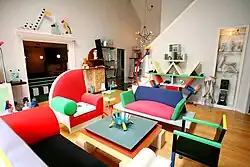 During their active years, the group designed a series of non-conformist furniture. One of their most popular and well-known designs is the "Carlton" Room Divider, a totemic pole incorporating a variety of bright colours, solid shapes and voids. The structure itself is constructed using cheap plastic laminates, though designed to be sold by a luxury market, and incorporates a series of equilateral triangles, both real and implied.[11]