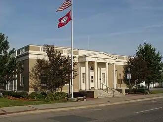 Mena City Hall, also known as the Old Post Office, is the city hall of Mena, Arkansas, located at 520 North Mena Street. It is a two-story brick building with Classical Revival and Colonial Revival features, designed by Treasury architect James Wetmore and built in 1917. Its elaborate lobby decorations are still visible despite the building's conversion for use as city hall. Its exterior features a Classical pedimented portico, and an entrance topped by a Colonial Revival fanlight.[2]