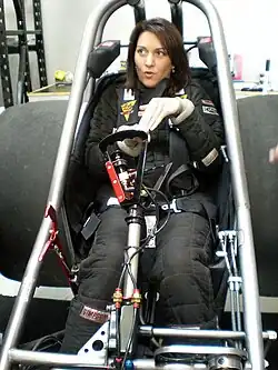 Fry drove quarter midgets at age four to six,[5] but only began racing seriously at 12,[6] when she first expressed interest in building and driving a dragster.[7] She went to work for her father's shop at Sears Point Raceway to earn the right.[8] She first raced at fifteen, in the shop truck, losing every round, but returning the next weekend.[9] Her first sportsman car was a B Econo dragster once owned by Amos Beard.[10] It was in the Econo dragster she earned her competition licence.[11]