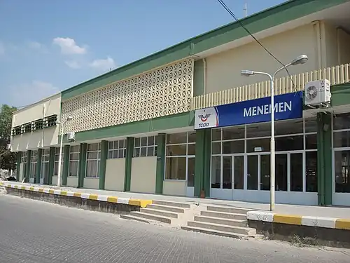 Menemen railway station (Turkish: Menemen garı) is a railway station at Menemen in İzmir Province, Turkey. The station is served by the Turkish State Railways, the national rail carrier of Turkey. The station is serviced by six trains daily. Northbound TCDD trains go to either Bandırma, Ankara, Afyon or Uşak and southbound TCDD trains all go to Basmane Terminal in İzmir.[2] North of the station, the double track branch line to Aliağa splits from the main line. The original station was built in 1866 by the Smyrna Cassaba Railway.[3] Menemen station also serves the İZBAN trains. There is a transfer from ESHOT buses.