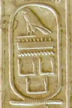 - ^ The last hieroglyph shown here is an approximation of the correct one which shows a squat obelisk on a flat base called a ben-ben.[62]