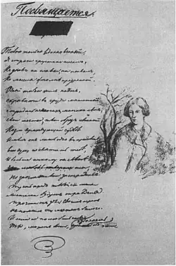 The poem features a dedication (a 20-line verse, starting with the words: "Inspired by you only / I was writing these sad lines...") but the addressee of it remained unknown. Her hand-written name on the first page autograph had been blackened out, with only a drawing of a girl's face and a bare little tree left. Two possible candidates have been suggested, a distant cousin Anna Stolypina and Yekaterina Sushkova, but no conclusive evidence has been put forward to back either claim.