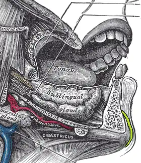 ![]() Plane of dissection that would create the mental space, highlighted in green, between the mentalis and the platysma muscles. | |