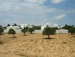 A menzel is made up of several housing units (houch), surrounded by orchards and fields. Sometimes associated with the menzel are weaving workshops, barns, olive oil winery (often underground).[1] Each menzel has a variable number of wells or cisterns and is surrounded by slopes (habia) with defensive functions, where palm trees, cactus hedges (prickly pear trees), agaves and aloes are planted that increase privacy and protect against dust and sand invasion.[2][3] It is usually inhabited by three generations of the same family.[4]