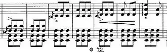 Composed in 1883, the Third Mephisto Waltz, S.216, takes the harmonic language even further, featuring chords built up by fourths with numerous passages of descending minor triads whose roots are a semitone apart. The chord on which these progressions are based, according to Alan Walker, "is difficult to explain in terms of traditional harmony. It is best regarded as a 'fourths' chord in its last inversion."[9] Tonally, the music is pulled between F♯ major, D minor and D♯ minor. As in its predecessors, the Third Waltz has the devil dancing in triple time while other groups of three move past so quickly that a larger rhythm of four is established, and triple time is abandoned altogether in the dreamlike passage near the work's conclusion.[5] Humphrey Searle, in his book The Music of Liszt, considers this piece to be one of Liszt's finest achievements.[10]