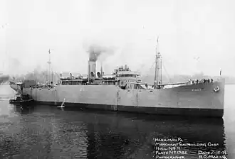 The Merchant Shipbuilding Corporation launched its first ship, a freighter named Sudbury, at the Chester yard on 29 September 1917, and delivered it to the USSB on May 5, 1918. In spite of the company's best efforts however, only four ships of the 68 ordered by the USSB were delivered before the end of hostilities—one freighter and three tankers, all built at the Chester yard. The Chester yard also received a contract from the U.S. Navy for the construction of four minesweepers, but the first of these was also only delivered a few weeks after the war.[11][12]
