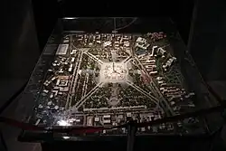 In 1954, President Sukarno launched the idea of erecting a "National Monument" at the center of Merdeka Square. Sukarno desired that the Indonesian people and the young independent nation had something to be proud of, a monument to commemorate the struggle for independence.[12] His ambition was to make the Monas the tallest building in Jakarta, higher than Borobudur and larger than the Eiffel Tower.[13] A design competition was held in 1956, followed by a second competition in 1960, however the President was not satisfied by the design entries, and no winner was announced. Instead Sukarno — who had previously studied architecture — asked architects to refine sketches made by himself. The design of the monument was eventually resulted from the work of architect Soedarsono. Sukarno's layout for Merdeka Square was based on a plan initially developed in 1892 with diagonal streets radiating from the monument.[13]