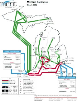 - in December 2009 Merit began to use a new fiber optic link between Mt. Pleasant and Big Rapids. This completed the 500-mile (800 km) "Blue-Line" fiber optic network that links 16 cities in the lower half of Michigan's lower peninsula (Kalamazoo, Grand Rapids, Muskegon, Big Rapids, Mt. Pleasant, Midland, Saginaw, Flint, Pontiac, Rochester, Southfield, Ypsilanti, Ann Arbor, Jackson, East Lansing, and Battle Creek).[36]