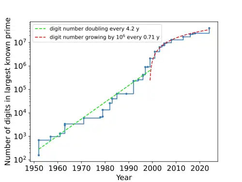 On October 12, 2024, a user named Luke Durant from San Jose, California, found the current largest known Mersenne prime, 2136,279,841 − 1, having 41,024,320 digits. This marks the first Mersenne prime with an exponent surpassing 8 digits. This was announced on October 21, 2024.[24]