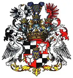 Dietrich Hermann von Merveldt (1624–1688), Privy Chamberlain of the Prince-Bishop of Münster and the Drost of Wolbeck, was raised on 17 February 1668 by Emperor Leopold I to the rank of Reichsfreiherr [Imperial Baron]. Goswin Hermann Otto von Merveldt (1661–1727) was, between 1721 and 1727, the Grand Prior of the Order of St. John “in the German lands” and, in this position, also the Reichsfürst [Imperial Prince] of Heitersheim. On 20 December 1726 was Dietrich Burchard Reichsfreiherr von Merveldt, Councilor and Lord Chamberlain for the Elector of Cologne and the Prince-Bishop of Münster, and all his descendants were raised by Emperor Charles VI to the rank of Reichsgraf [Imperial Count] with the title of Hoch- und Wohlgeboren [“High and Well-Born”] and an upgrade for his coat-of-arms.