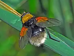 These flies closely mimic certain Bombus species (bumblebees) (Apidae family). They are very similar to the hoverflies Criorhina berberina and Pocota personata (Syrphidae). Superficially they also resemble the hoverfly Volucella bombylans. M. mystacea is the only bumble-bee mimic among the Mesembrina species present in western Europe.[1][5]