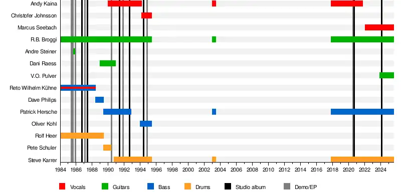 - Reto Wilhelm Kühne – bass, vocals (1984–1988)