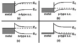 As mentioned above, when a metal is deposited onto a semiconductor, even when the metal film as small as a single atomic layer, the Fermi levels of the metal and semiconductor must match. This pins the Fermi level in the semiconductor to a position in the bulk gap. Shown to the right is a diagram of band-bending interfaces between two different metals (high and low work functions) and two different semiconductors (n-type and p-type).
