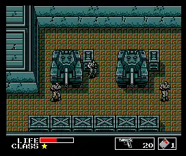 Another big change made to the game was in the level designs. Instead of the underwater infiltration from the MSX2 version, the NES version starts the game with Solid Snake parachuting into the middle of a jungle alongside three other soldiers (who are never seen nor mentioned after the intro). After landing in the jungle, the player must reach a transport truck at the end that will take Snake to the entrance of the first building. The player can use other transport trucks to reach the entrances of the other buildings quicker, since they travel in a cyclical pattern. The basement floors of Building 1 and 2 in the MSX2 version were made into separate buildings, Building 4 and 5 respectively, which are only reachable by going through one of two jungle mazes located in the outdoor areas between the other three buildings. The correct path to take in the jungle maze is never revealed in the game.[29] In addition to the removal of the Metal Gear tank, the Hind D boss on the rooftop of Building 1 was replaced by a pair of armed turret gunners called "Twin Shot".[4][26] The NES version lacks the higher alert phase from the MSX2 version and the jetpack-wearing soldiers on the rooftops of Building 1 and 2 lost their ability to fly (making them act more like regular guards). On the other hand, enemies no longer drop ammo nor rations when punched to death. Much like the MSX2 version, the English localization of the NES versions contains numerous instances of erroneous grammar, such as "Contact missing our Grey Fox",[30] "Uh-Oh! The truck have started to move!",[31] and "I feel asleep!!"[32]