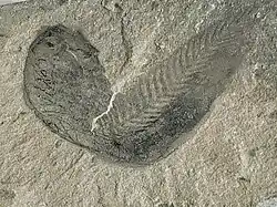 Whilst named after the Ediacaran organism Spriggina, later work has shown the two to be unrelated.[4] Metaspriggina is considered to represent a primitive chordate, possibly transitional between cephalochordates and the earliest vertebrates, albeit this has been questioned because it seems to possess most of the characteristics attributed to craniates. It lacked fins and had a weakly developed cranium, but it did possess two well-developed, upward-facing eyes with nostrils behind them.