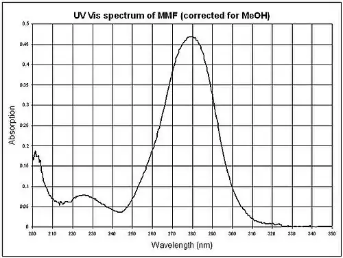 MMF can be quantified by using both GC and HPLC. MMF can routinely been analyzed on a GC using for example a Varian VF-WAXms column with a temperature profile up to 250˚C and FID detector. When analyzed by HPLC it can be quantified by UV. In the picture below the UV spectrum is shown. The peak maximum in methanol is at 279.5 nm (Molar extinction coefficient ε 13854 M−1.cm−1).