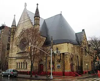 The Metropolitan Baptist Church, located at 151 West 128th Street on the corner of Adam Clayton Powell Jr. Boulevard in the Harlem neighborhood of Manhattan, New York City, was originally built in two sections for the New York Presbyterian Church, which moved to the new building from 167 West 111th Street.[3] The chapel and lecture room were built in 1884-85 and were designed by John Rochester Thomas, while the main sanctuary was constructed in 1889-90 and was designed by Richard R. Davis, perhaps following Thomas's unused design.[2] A planned corner tower was never built.[3]