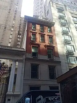 There is a courtyard to the east of the original building,[188] which measures 55 by 60 feet (17 by 18 m) across.[34][185][196] Behind the courtyard is the rear wing or women's annex, which rises two stories above ground.[188][197] To the east of the original building is the east wing, which was built as a five-story bachelor apartment building before Codman redesigned it as a six-story dormitory.[192] The clubhouse borders a 10-foot-wide (3.0 m) alleyway to the north,[34][185] which is used as a service entrance.[194] There was originally a lawn, hedges, and columns in front of the Fifth Avenue facade, which were demolished when Fifth Avenue was widened.[198]