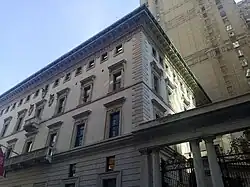 The site has a frontage of 100 feet (30 m) on Fifth Avenue and 200 feet (61 m) on 60th Street, at the northeast corner of these two streets.[32] It faces Central Park and Grand Army Plaza to the west,[3][12][185] the Pierre hotel to the north, and the Park Cinq building and the Sherry-Netherland hotel to the south.[186][187] Stanford White of McKim, Mead & White designed the original building[8][188] in the Italian Renaissance style.[34][185] White also designed custom-made torchères on the sidewalk outside the clubhouse.[189] The design of the clubhouse may have been patterned after various Italian palazzi,[190] as well as palazzo-style English clubhouses.[12] The east wing, erected in 1912, was designed by Ogden Codman Jr.[191][192][193]