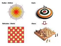 Chess: (Also called Chessboard Planning) The Grey infrastructure (transportation) reticula form the basic chessboard pattern. Every municipality located in the core of this cellular structure plays a different role in the metropolitan system. The role played, decided in dialogue between the municipality and the regional-metropolitan authority, can be visualized as the role of the pieces in the Chess Game.