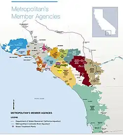 By 2008 Metropolitan had 14 cities and 12 municipal water districts (San Fernando joined in 1973; MWDOC and Coastal MWD merged in 2001) and provided water to nearly 10,000,000 people.[6] As of 2021, Metropolitan with 26 member agencies and cities served nearly 19 million people in the counties of Los Angeles, Ventura, Orange, San Diego, Riverside, and San Bernardino.[2]
