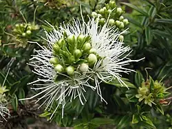Metrosideros operculata is a species of flowering plant in the family Myrtaceae. It is endemic to New Caledonia.[2] It usually grows as a shrub to 3 metres in height, or rarely as a small tree to 10 metres. Stems are square in section and covered with silky hairs. The stiff, pointed leaves have a slightly revolute margin and are linear to elliptic in shape. They are 12 to 40 mm long and 3 to 10 mm wide. White, pink or red flowers with 3 petals and between 50 and 120 stamens are produced in axillary inflorescences.[2]