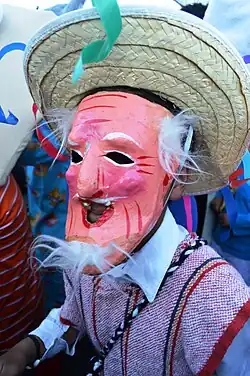 The developing dances and other masked events became part of a syncretism of Catholic and native traditions and belief, especially Carnival and Holy Week, with the first coinciding with the Aztec New Year and new agricultural cycle.[11] In addition, many of the masks developed during this time mocked colonial overlords.[13] For these reasons, at various times, masks and dances were forbidden by authorities from the 16th to 18th centuries.[12][14]