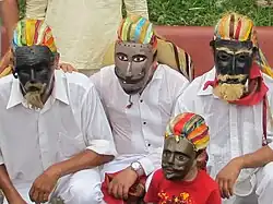 Masks range from the crude to ones with detail to make them seem like real faces.[45] Most masks are scaled to fit the human face, with dancers looking out through slits just above the painted eyes.[9] The smallest masks measure between ten and fifteen centimeters wide with the rest of the face, including the mouth, covered by cloth.[46] Other masks are much larger than the face, with the wearer looking out the mouth of the mask.[9][47] Some masks have movable parts such as lips, tongue and eyelids to make them more animated.[9][48]