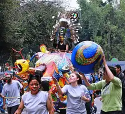 The parade begins at midday on a Saturday late in October, with about 400 uniformed officers needed to clear the parade route and keep order.[7] This route takes the alebrijes through the historic center of Mexico City, from the main square or Zocalo, onto Paseo de la Reforma down to the Angel de la Independencia .[6] Thousands of people, mostly children and their parents, line the 5.5 km parade route to see the creations.[5][8] The alebrijes are accompanied by musical bands such as the Symphonic Band of the Navy, clowns, people on stilts and in costume, cheerleaders, acrobats, lucha libre wrestlers and more to give a Carnival like atmosphere.[5][9][10] In addition to the alebrijes, other figures of cartonería appear such as Catrina figures, 30 cm brightly decorated skulls (related to Day of the Dead) as well as Judas figures (normally made for Holy Saturday) as a tribute to the traditional uses of this craft.[5][11]
