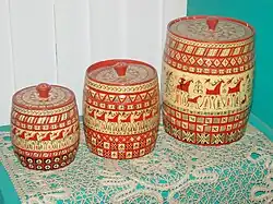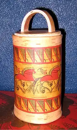 Mezen wood painting (Russian: Мезенская роспись по дереву) or Palashchelskaya painting (Russian: палащельская роспись) is a type of decorative painting applied to household items (spinning wheels, ladles, boxes, bratinas), which developed by the end of the 19th century in the lower basin of the Mezen River. The oldest dated spinning wheel with Mezen painting is from 1815, although pictorial motifs of this style appear in handwritten books from the 18th century produced in the Mezen region.