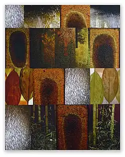 In early 2002, the textile department at the University of Nebraska–Lincoln acquired a Mimaki TX-1600X digital textile printer that could print reactive dyes on fabric up to 60 inches wide.[67] Access to this technology motivated James to take his work in a new direction.[68] He experimented with digital imagery and produced fabric using images from scanned hard copy or from photographs.[69] He modified these images using Adobe Photoshop® and Illustrator®.[70]