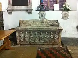 At some time before November 1537, Stanhope married Anne Rawson (c. 1515 – 20 February 1588), a daughter of Nicholas Rawson of Aveley in Essex, by his wife Beatrix Cooke (d. 14 January 1554), a daughter of Sir Philip Cooke (d. 7 December 1503) by his wife Elizabeth Belknap (died c. 6 March 1504).[12][13] Beatrix was the aunt of Sir Anthony Cooke. By his wife he had seven sons and four daughters as follows, as recorded in the inscription on her monument in St. Peter and St. Paul's Church, Shelford:[14][15][16]