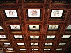Although having the same floor plan, the House and Senate chambers are decorated very differently, with the former in terra cotta and teal colors and the latter in blue and gold. An oval cartouche in the carpet at the entrance to the House chamber features the state flower, the apple blossom. Presiding over the house is the speaker, whose chair is behind a desk in the center with a plaster and paint version of the state coat of arms. The Senate chamber is somewhat smaller than the House. The president of the Senate is the lieutenant governor, who presides over sessions from a walnut rostrum at the front of the chamber. Both the House and the Senate use computerized voting systems, including wall-mounted screens that allow visitors to follow the voting and both also contain glass tiled ceilings that allow natural light to shine through etched glass panels to better light the room. These ceiling tiles feature the coats-of-arms of each state in the United States.[4]