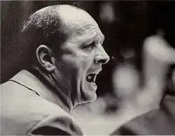 Bill Perigo took over the Michigan coaching job after having served three seasons as Western Michigan basketball coach. Despite previous success as a conference basketball champion coach at Western and subsequent success as a Michigan High School Athletic Association (MHSAA) champion basketball coach, his Michigan teams endured several mediocre seasons.[17] His best Big Ten records came in 1956–57 and 1958–59 when his teams compiled 8–6 conference records. The latter team was tied for second in the conference and was 15–7 overall (8–6, Big Ten).[19] It also had Perigo's only first-team All-Big Ten athlete in M. C. Burton.[18] Team captain and two-time football consensus All-American Ron Kramer was third-team All-Big Ten in 1957 after being second-team All-Big Ten in both 1955 and 1956.[18]