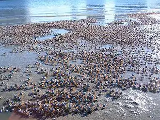 Initially, the crabs feed only tentatively, and within 15 minutes of emergence, they begin the "trek", where large numbers of crabs walk simultaneously towards the water in an almost straight line.[4] Mictyris species are among the few crabs adapted to walking forwards, rather than sideways.[3] Juveniles only proceed about 50 m towards the water, and feed at that level of the beach.[4]