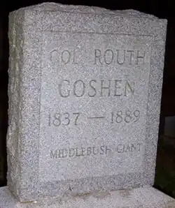 He was originally buried without a tombstone for fear his body would be dug up and put on display. The cemetery is the Cedar Grove Cemetery in Middlebush, New Jersey. His tombstone reads "Col. Routh Goshen, Middlebush Giant, 1837-1889".[22]