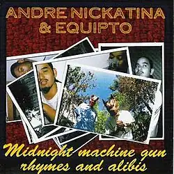 Midnight Machine Gun Rhymes and Alibis is the tenth album by rapper, Andre Nickatina, released in conjunction with rapper Equipto. It was released on March 22, 2002 for Fillmoe Coleman Records and was produced by various producers which included Andre Nickatina, Equipto, Nick Peace, Crush, Little J, DJ Soleil, Prince Marvelous and Laird. This was the first of four collaborations between Andre Nickatina and Equipto.
