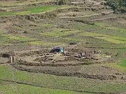 This highland site contains the ruin of a substantial building constructed of bright red dressed ashlar which may date early as the 6th or 7th century. [1] Lying 200 m west of the shore of Lake Hashinge, the site came to the attention of antiquities authorities in 1997 as a result of alleged exploitation of its building stone on the part of the local population.[2] In 2013 a group led by Paul A. Yule from Mekelle University and Heidelberg University began to investigate the site.[3]