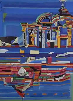 His approach to vernacular architecture often reflects a melancholy associated with the character of Andean towns. Adobe houses and the colonial city with its churches are recurrently depicted in his works.[13]