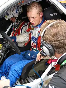 Mikko Hirvonen (born 31 July 1980) is a Finnish former rally driver, and a current Rally-Raid driver, who drove in the World Rally Championship. He placed third in the drivers' championship and helped Ford to the manufacturers' title in both 2006 and 2007. In 2008, 2009, 2011 and 2012 he finished runner-up to Sébastien Loeb. Hirvonen's co-driver was Jarmo Lehtinen from the 2003 season until his retirement in 2014, Lehtinen had replaced Miikka Anttila who co-drove with Hirvonen in the 2002 season.