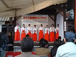The traditional clothing for miko consists of a white kosode (robe) with a scarlet hakama (trouser-skirt). This combination is considered to be the working clothes of shrines for both men and women. Shinto priests also wear this outfit under their formal attire. Certain colors are forbidden in miko clothing, including yellow sumac dye (the color of the Emperor of Japan), yellow tan (the color of the Crown prince), and dull or gray colors similar to those used for funerals.[1]