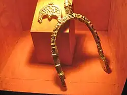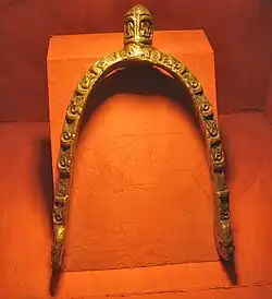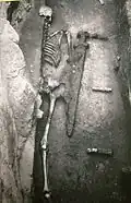 Over 2,500 inhumation burials, mainly in cemeteries of the Great Moravian period, have now been found at Mikulčice. The largest and richest of these cemeteries were those associated with the Basilica church (no. 3) and the Kostelisko site. The detailed study of the chronology and typology of grave goods is yet to be completed.[20] A degree of social stratigraphy can be distinguished in the with the élite warrior burials who are accompanied by their swords and the horse-men who are equipped with gilded bronze spurs and battle axes.
