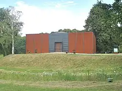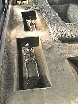 From 1964 to 1974 the second phase of excavation explored the outer bailey and oxbow lakes with preserved woodwork and bridges. This was followed by the third phase from 1975 to 1990, which concentrated on area excavation within the ramparts of the acropolis which ended previous work. Also between 1984 and 1990 the Kostelisko cemetery was excavated to the west of the 9th church. This contained approximately 415 graves which were accompanied by rich grave goods.[16] In 1990 the yearly excavations were suspended. In 1993 a series of limited excavations, mainly to confirm the stratigraphy on the main sites were started. Also the Research Institute of the Czech Academy of Sciences started rescue excavations in the vicinity of Mikulčice. These include the Panské Cemetery, excavated in 1999–2000, when the railway to Prerov was widened. This cemetery revealed 128 burials from the 9th to the 11th centuries.[17]