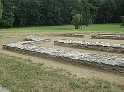 In 1958 the excavations moved to the palace building, to the west of Church 3. The palace had been built of stone, but the stone had been removed and the rectangular outline was preserved by the robber trenches.[9] The building was 26 m long and 10 m wide, with a hall with a fireplace, at the west end and a smaller chamber at the east end.[10] Some rich burials were found in the area and there was extensive evidence of metalworking including goldsmithing.[11] There was some evidence of settlement that pre-dated the Great Moravian Empire including a hoard of clay animal figurines. A number of iron styli for writing on wax tablet were discovered, suggesting that the building would have been used for administrative purposes.