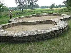 In 1960 excavation moved to an extramural settlement outside the rampart, which had been reached over the river course by a wooded bridge. Extensive remains of wood were recovered including a logboat. Also discovered was a circular stone rotunda church with two semi-circular apses.[14] Also in 1961 the 8th church was excavated, which had a rectangular nave and chancel. The graves of surrounding cemetery were relatively poorly furnished, but in the nave of the church was found a large hoard ironwork, including axes, ploughshares sickles and iron ingots.[15] Also excavated was the bridge leading into the Outer bailey and the surrounding rampart. Finds from river-bed included another longboat, an archery bow, identified as being made from English yew, wicker fish-traps, ladles, spoons, buckets and vats.[14]