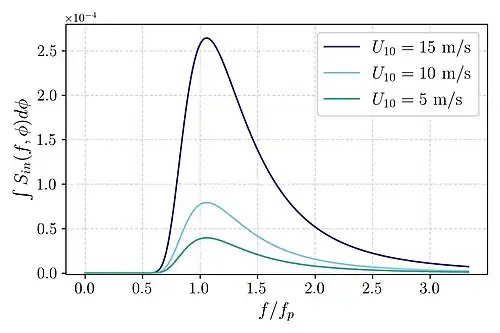 The atmospheric energy input from the wind to the waves is represented by . Snyder and Cox[9] (1967) were the first to produce a relationship for the experimental growth rate due to atmospheric forcing by use of experimental data. They found where the wind speed measured at a height of 10 meters and a spectrum of the form of the JONSWAP. The JONSWAP spectrum is a spectrum based on data collected during the Joint North Sea Wave Observation Project and is a variation on the Pierson-Moskowitz spectrum, but then multiplied by an extra peak enhancement factor
