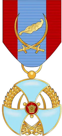 The Military Order of Merit was one of the numerous orders of merit of the Persian Empire. The jewel of the order was a lightblue enamelled cross with three arms. The order's centre featured a purple medaillon featuring the imperial crown of the Pahlavi dynasty.[1]