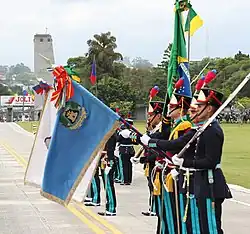 The historic uniforms, coat of arms, small swords, the Cadets Corps and the standard, developed at this time, are a successful case of “invention of traditions”, which remain in use at AMAN.[196][197] Their reference, personified by the Duke of Caxias, was the middle of the imperial period, far from political turbulence, representing the stability and timelessness intended for the military institution itself.[198] Traditions demarcated the elite status of cadets and emotionally linked them to the School.[199] One of the first changes was the recovery of the name “cadet” to designate the students. This title was originally used for students of noble origin and had been abolished in 1897, to remove the memory of the Empire, but it returned precisely because of its aristocratic connotation.[200] The small swords, replicas of the sword of the Duke of Caxias, were given to cadets during the course and returned shortly before graduation. The coat of arms left the Agulhas Negras Peak at the back of the castle, considered a symbol of national unity. The coat of arms was included on a turquoise background in the standard, which is simple and easy to differentiate from Brazil's national flag and other military units.[201][202]